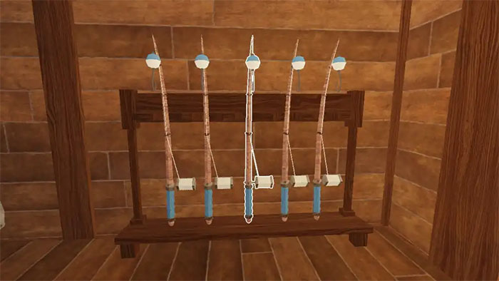 Khi trang bị cần câu, một thanh XP của cần câu sẽ hiện trên màn hình. Càng câu được nhiều cá, game thủ càng tích lũy XP. Khi thanh XP đầy, cần câu sẽ phát sáng. Lúc này, hãy quay lại túp lều, đi về phía bên trái để tìm bàn nâng cấp Upgrade Bench, trang bị cần câu và nhấn E để nâng cấp miễn phí.