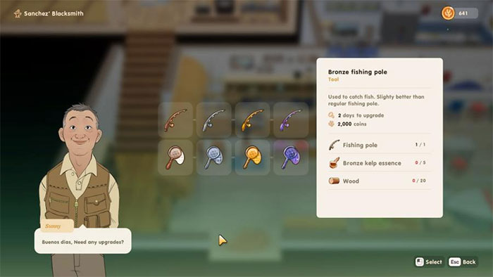 Cần câu ban đầu là phiên bản cơ bản nhất nên sẽ không có sức mạnh như những chiếc cần được nâng cấp khác. Nếu mong muốn bắt được những con cá quý hiếm hơn, người chơi sẽ cần nâng cấp nó. Quay lại gặp Sunny tại Beach Shack và chọn Upgrade Tools trong cửa hàng. Tuy nhiên, những nâng cấp này sẽ tiêu tốn một chút chi phí để thực hiện, cụ thể như sau: