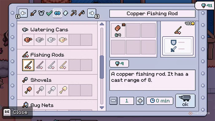 Tại lò rèn, nằm ngay bên trái cửa hàng và nhà của March, game thủ có thể tự chế tạo cần câu với các loại thỏi kim loại khác nhau như Copper, Iron, Silver và Gold. Chúng có phạm vi ném lần lượt là 8, 10, 12 và 14 ô.