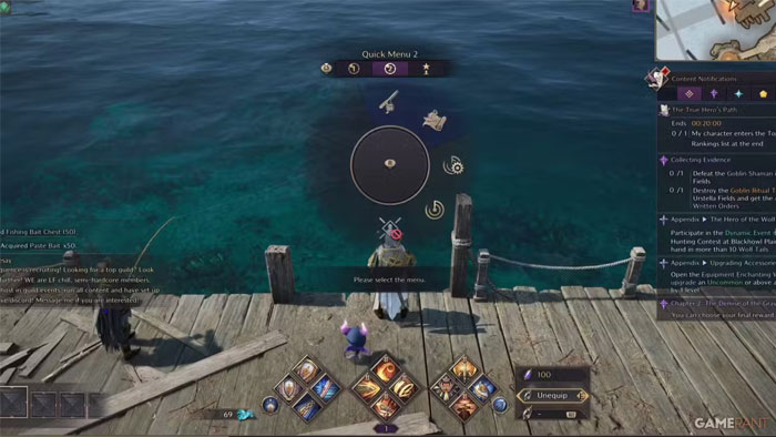 Mở phần Character trong menu và nhìn lên góc trên bên trái của vũ khí được trang bị. Tại đây, game thủ sẽ thấy cần câu và mồi câu nào mình sẽ trang bị. Người chơi sẽ cần những lựa chọn khác nhau tùy thuộc vào những gì mình định câu. Khi cả hai slot đều đầy, hãy đến bất kỳ bờ biển nào trong khu vực để câu con cá đầu tiên.