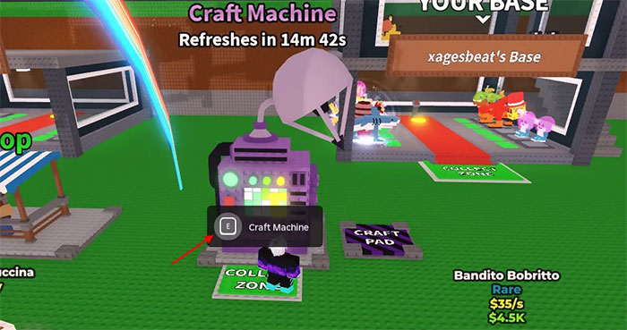 Craft Machine nằm ngay bên cạnh Coins Shop trong Steal a Brainrot. Nó hơi khác với Fuse Machine, nhưng lại rất hữu ích để tạo brainrot mới. Bên cạnh đó, Craft Machine sẽ làm mới mỗi 30 phút. Người chơi có thể truy cập Craft Machine bằng cách: