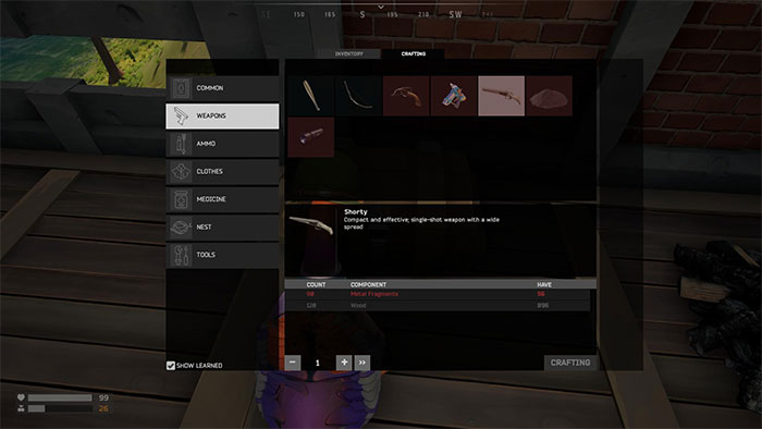 Sau đó, mọi người sẽ cần một vũ khí có phạm vi tấn công xa hơn một chút. Bow dễ chế tạo hơn Crossbow, loại này yêu cầu Metal Fragments, Wire và Workbench. Ngược lại, Bow chỉ yêu cầu Wood và Rope. Thêm vào đó, Arrow dùng với Bow chỉ yêu cầu Wood và Stone, cả hai đều không khó tìm trong thế giới game. Sau khi đã thiết lập căn cứ và có Workbench, hãy chế tạo Shorty. Súng ngắn hai nòng sẽ là cứu cánh trong trường hợp cấp bách.