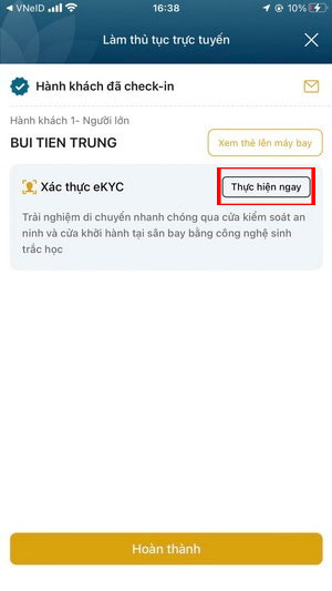 Bước 7: Khi đã hoàn thành check in online trên ứng dụng hãng hàng không, nhấn vào Xem thẻ lên máy bay, chọn mục Xác thực eKYC và nhấp Thực hiện ngay để xác thực danh tính.