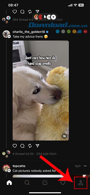 Bước 1: Truy cập ứng dụng Threads và nhấn vào biểu tượng trang cá nhân.
