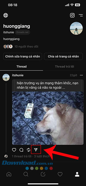 Bước 2: Tại bài đăng Threads muốn chia sẻ, nhấn vào biểu tượng máy bay để mở menu pop-up.
