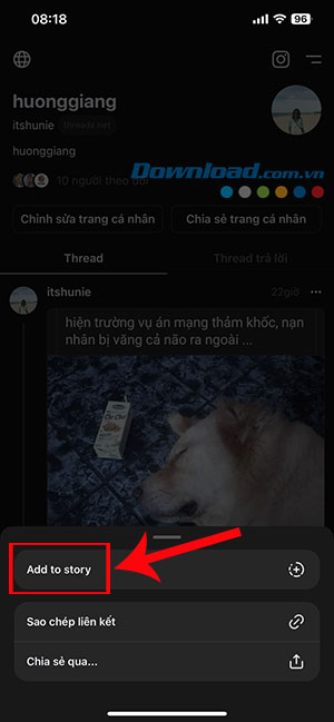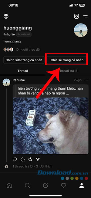 Bước 1: Sau khi đã đăng bài viết của mình trên Threads, mọi người cần nhấn vào biểu tượng trang cá nhân và tìm Threads post muốn chia sẻ lên Story.