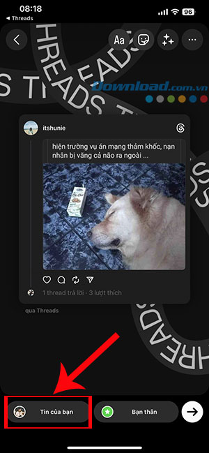 Bước 4: Giao diện đăng Story sẽ xuất hiện và người dùng có thể tiến hành chỉnh sửa Story như thêm nội dung văn bản, sticker,... và bấm nút Tin của bạn. Ngay lập tức, bài đăng Threads sẽ được chia sẻ lên Instagram Story.