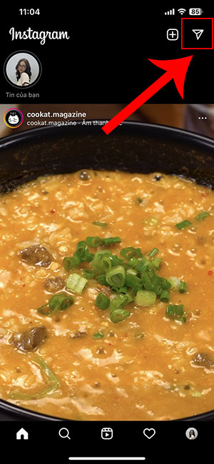 Bước 2: Khi quá trình cập nhật đã hoàn tất, mở ứng dụng Instagram trên thiết bị và nhấn vào biểu tượng máy bay ở góc trên cùng bên phải để mở tin nhắn Direct Message.