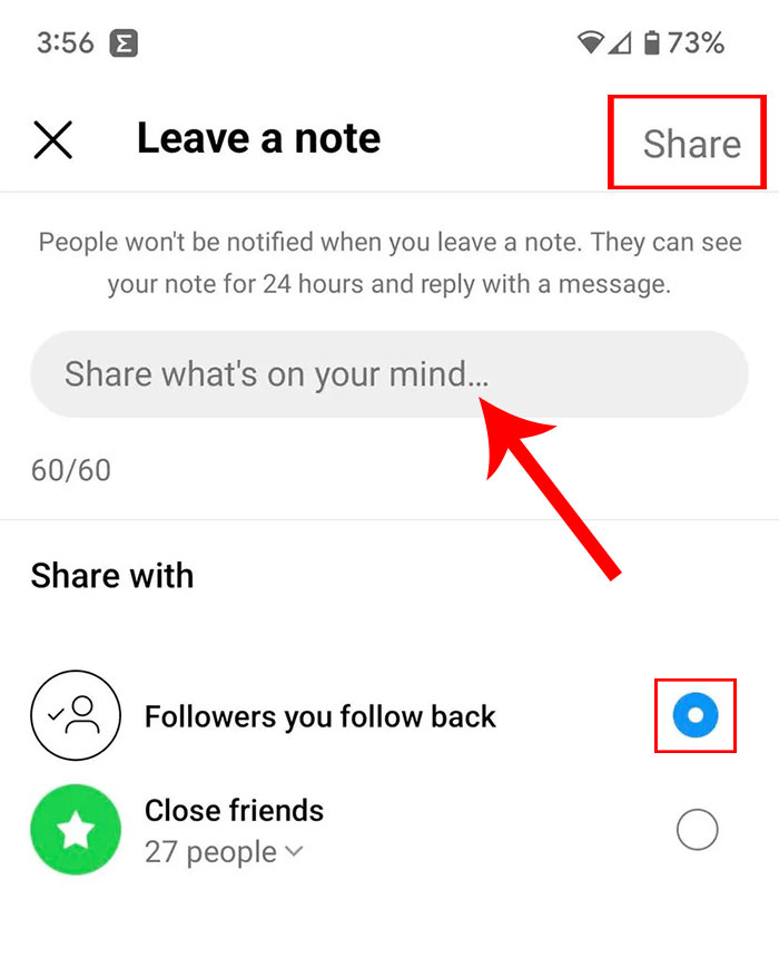 Nhập nội dung ghi chú muốn chia sẻ lên Instagram và nhấn vào Chia sẻ. Bài hát sẽ phát lên khi ai đó xem ghi chú của bạn.