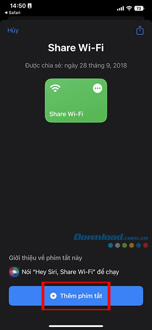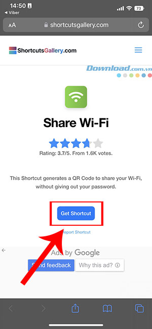 Bước 1: Mở Shortcut Gallery bằng trình duyệt web trên iPhone và nhấn vào Get Shortcut để tải xuống phím tắt Share Wi-Fi.