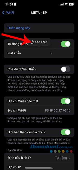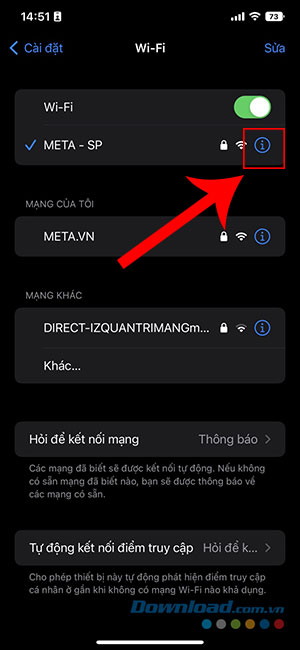 Bước 2: Để xem mật khẩu của Wi-Fi mà mình đang kết nối, hãy nhấn vào nút i bên cạnh tên mạng đó.