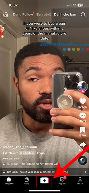 Bước 1: Mở TikTok và nhấn vào dấu cộng để chuyển đến trang tạo video mới.
