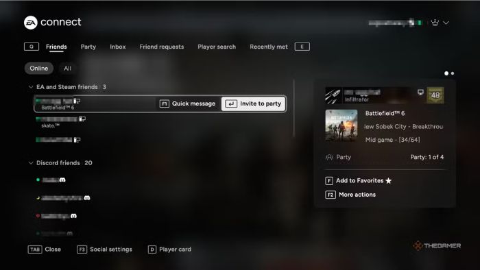 Mọi người cũng có thể kết nối danh sách bạn bè Discord với EA Connect để việc chơi chéo nền tảng dễ dàng hơn. Ngoài ra, từ giao diện chính, nhấn biểu tượng + để xem danh sách bạn bè đang online và mời họ trực tiếp vào sảnh.