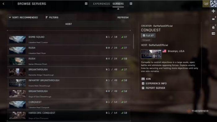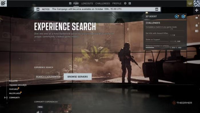 Battlefield 6 có mục Portal, nơi chứa các chế độ do cộng đồng sáng tạo. Người chơi có thể truy cập qua tab Community để duyệt danh sách server.