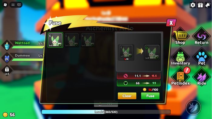 Nếu có nhiều bản sao của cùng một thú cưng, người chơi có thể hợp nhất chúng. Hãy tương tác với NPC Fusion nằm gần điểm xuất phát để vào menu hợp nhất. Game thủ cần ít nhất 4 bản sao của thú cưng muốn nâng cấp và tiêu một số tiền xu. Việc hợp nhất sẽ tăng các chỉ số khác nhau, nhưng không tăng cấp thú cưng.