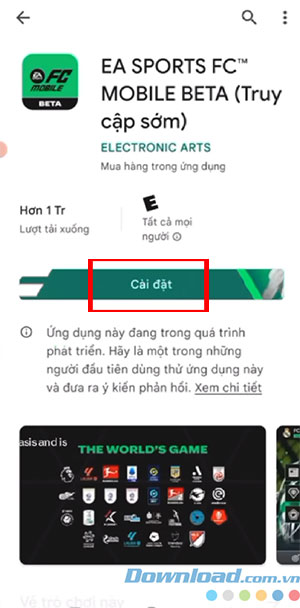 Bước 1: Truy cập EA SPORTS FC MOBILE BETA cho Android và nhấn Cài đặt để bắt đầu tải xuống phiên bản beta của trò chơi. Ngoài ra, người dùng có thể tìm kiếm EA Sports FC MOBILE BETA trên Google Play Store.