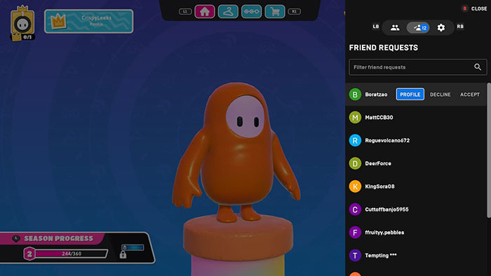 Để chơi Fall Guys với bạn bè, trước tiên người chơi cần mời người bạn đó. Để thực hiện việc này, hãy thêm tài khoản Epic Games của mình vào trò chơi. Người bạn bè được mời cũng cần phải có tài khoản Epic Games. Tùy thuộc vào nền tảng, hãy làm theo các bước sau để đến menu sảnh của trò chơi: