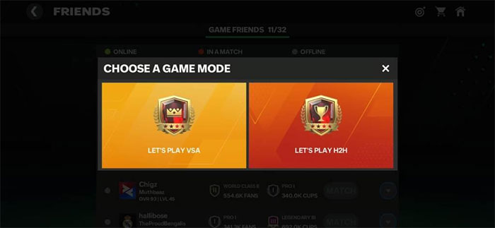 - Cả hai người phải đang trực tuyến cùng lúc trong FC Mobile. Một trong hai người nhấn Match bên cạnh tên bạn bè trong danh sách, chọn chế độ muốn chơi (VS Attack hoặc H2H), rồi gửi yêu cầu trận đấu.