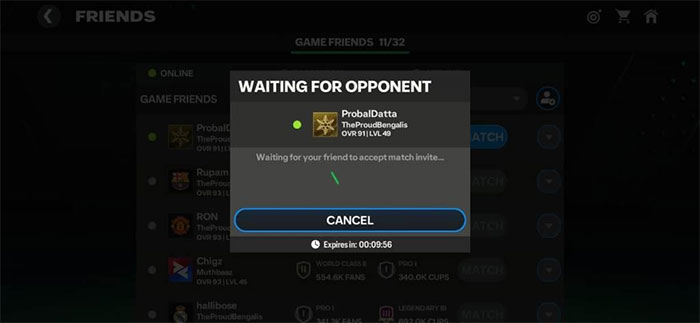 Để thiết lập Friend Match trong FC Mobile, trước hết, hãy đảm bảo rằng bạn và bạn bè của mình đều đã đăng nhập vào trò chơi, tức là cả hai đều trực tuyến. Sau đó, chỉ cần 1 trong 2 người gửi yêu cầu tham gia trận giao hữu và người còn lại chấp nhận.