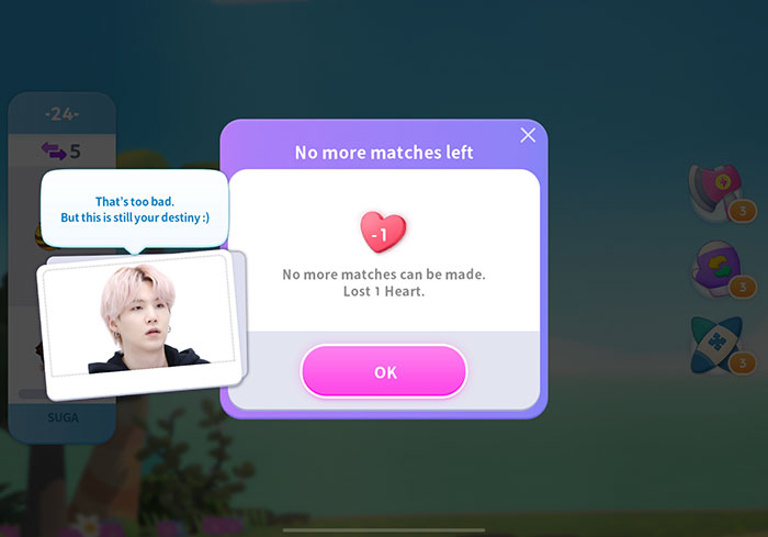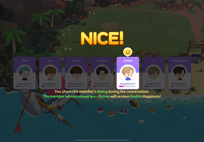 Sau khi có nhiều vật phẩm hơn để tương tác, game thủ có thể sử dụng những vật phẩm này theo thời gian để nâng cao mức độ hạnh phúc của nhân vật. Hãy đưa một trong số 7 thành viên đến ARMY Bomb để nghe một bài hát của BTS.