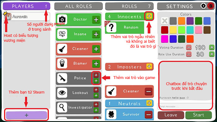 Trong hình bên dưới, mọi người có thể thấy các khu vực thiết lập trò chơi. Trong phần cài đặt, thời lượng chơi một trận đấu có thể được điều chỉnh. Voting Duration (Thời lượng biểu quyết) cho phép đặt thời lượng bỏ phiếu vào ban ngày.