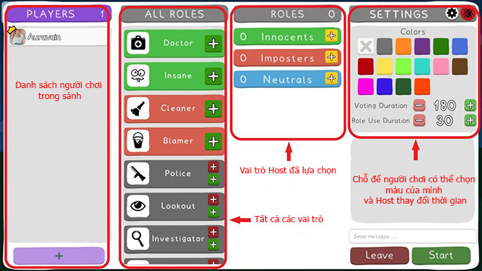 Ở góc trên bên trái, mọi người có thể thấy các vai trò trong trò chơi. Nếu một vai trò ngẫu nhiên đã được thêm vào, chúng sẽ xuất hiện dưới dạng dấu chấm hỏi. Đồng thời, người chơi có thể thấy vai nào là vô tội hoặc kẻ mạo danh từ các khung màu xanh và đỏ.