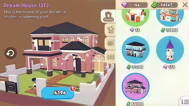 Khi ở đó, hãy đến gần bảng tên phía trước ngôi nhà và nhấn vào biểu tượng ngôi nhà. Như đã nói từ trước, ban đầu bạn có một ngôi nhà hộp có thể nâng cấp bằng tiền. Khi chạm vào biểu tượng ngôi nhà (trên bảng tên), bạn sẽ thấy rất nhiều tùy chọn nhà ở và chi phí của chúng:
