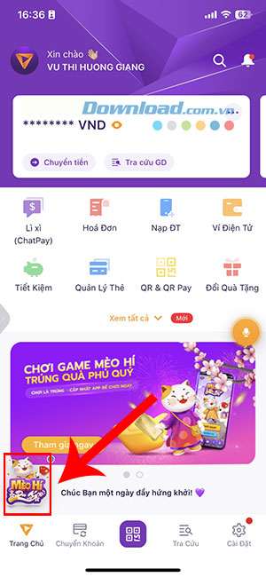 Bước 2: Nhấn vào biểu tượng Mèo Hí hoặc banner chương trình trên trang chủ.