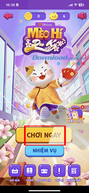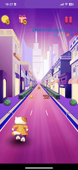 Bước 4: Điều khiển chú mèo qua lại giữa 3 làn đường bằng cách vuốt qua trái phải để thu thập vật phẩm trên đường, đồng thời né tránh các chướng ngại vật.
