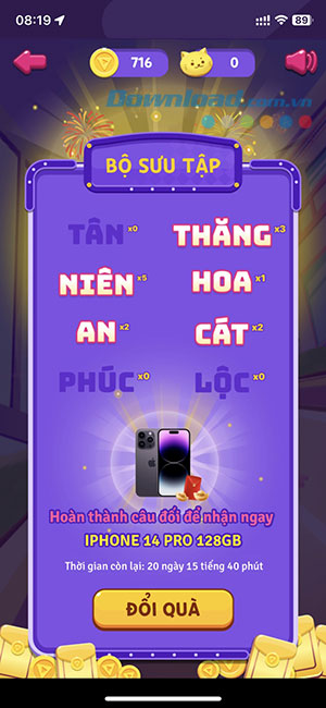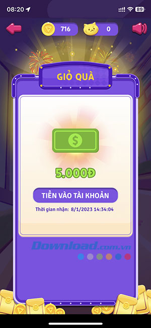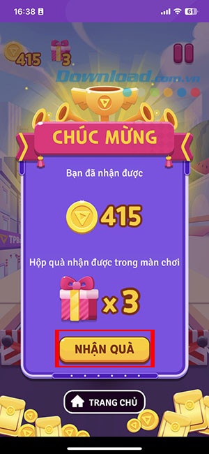 Bước 5: Sau khi hoàn thành lượt chơi, thông báo chúc mừng sẽ hiển thị số xu và hộp quà thu thập được, lúc này hãy nhấn vào Nhận quà.