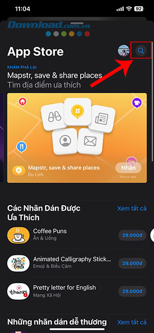 Người dùng cũng có thể chạm vào biểu tượng kính lúp ở góc trên cùng bên phải, nhập từ khóa tìm kiếm là game để xem danh sách gợi ý trò chơi mà App Store cung cấp và chọn một trò chơi để tải xuống.