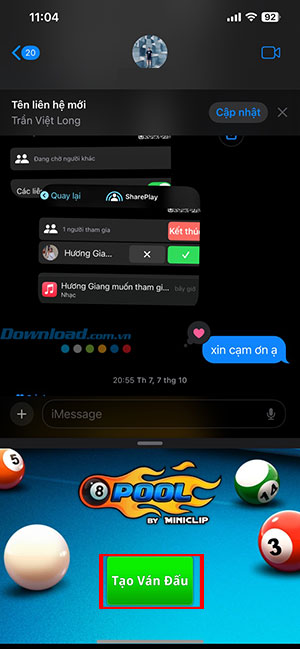Bước 5: Bây giờ hãy quay lại giao diện cuộc trò chuyện, chạm vào dấu + và tìm biểu tượng của trò chơi mới cài đặt (bài viết này sử dụng 8 Ball Pool). Nhấn vào biểu tượng và trò chơi sẽ bắt đầu bên dưới.