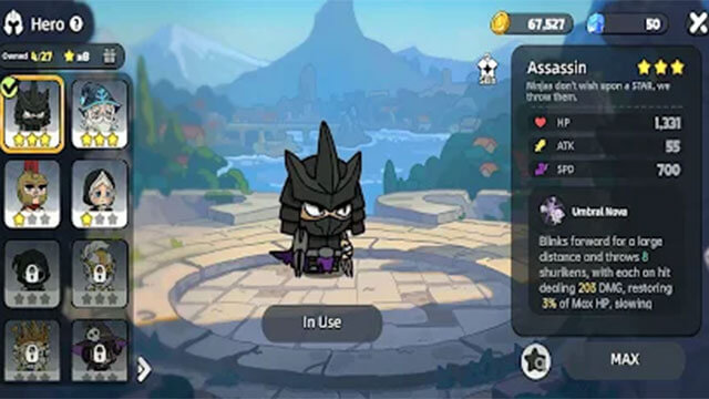 Mỗi anh hùng có kỹ năng, tốc độ và HP riêng. Chẳng hạn khi chiến đấu với boss có nhiều máu và sát thương cao, hãy chọn Mage để làm chậm và gây sát thương lớn hơn.