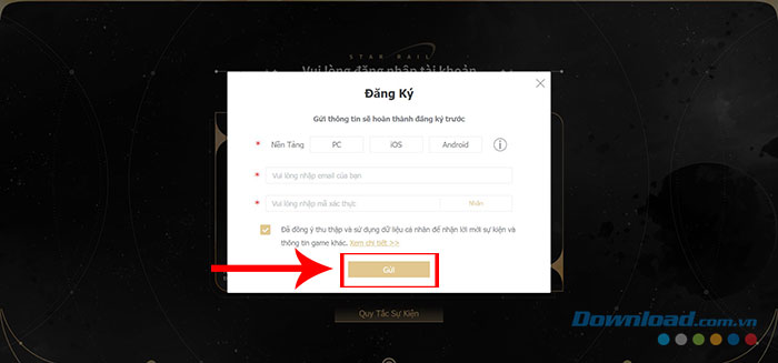 Bước 3: Một cửa sổ Đăng ký sẽ xuất hiện, người chơi cần chọn Nền tảng sẽ chơi game, nhập email và mã xác thực. Cuối cùng, đồng ý với điều kiện và điều khoản, sau đó nhấn nút Gửi để hoàn thành đăng ký chơi Honkai Star Rail beta.