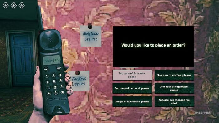 Vào ngày đầu tiên, hãy bật TV cho đến khi thấy quảng cáo của dịch vụ giao hàng ForRest, sau đó dùng điện thoại để gọi và đặt hai lon EnerJeka. Mỗi lon giúp bạn hồi 1 điểm thể lực sau khi uống, nên có vài lon trong tủ lạnh.