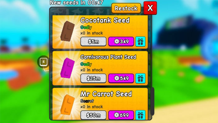 Hạt giống có nhiều độ hiếm: Rare, Epic, Legendary, Mythic, Godly và Secret. Độ hiếm không chỉ ảnh hưởng đến tỷ lệ xuất hiện trong cửa hàng mà còn quyết định sức mạnh của cây. Những cây hiếm như Cocotank và Mr Carrot gây sát thương cao và có hiệu ứng mạnh mẽ. Nếu muốn nhổ cây trong vườn, hãy dùng xẻng Shovel.