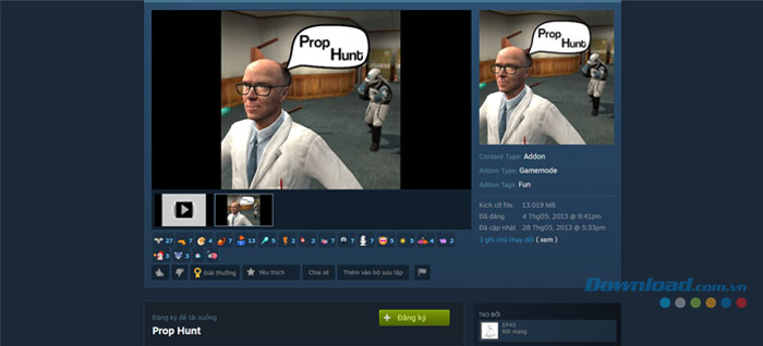 - Nhấn Đăng ký vào một addon phổ biến (ví dụ: Prop Hunt: Enhanced).