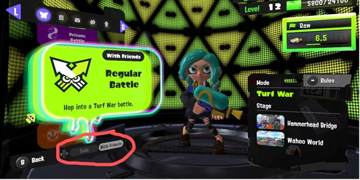 Mọi người sau đó phải đến Battle Lobby và tạo phòng. Để làm điều đó, hãy đi vào thang máy được sử dụng để tham gia các Turf Battles thông thường. Sau đó, sử dụng bộ điều khiển để đi sang phải và with friends sẽ xuất hiện trên tùy chọn Regular Battle.