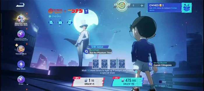 - Hình nền độc quyền Conan Edogawa & Kid the Phantom Thief: Có thể nhận được thông qua sự kiện Lucky Draw diễn ra vào ngày 8 tháng 8. Việc sử dụng hợp lý các sự kiện rút thăm và nạp tiền hàng ngày sẽ giúp giảm giá xuống còn khoảng 2000 token.