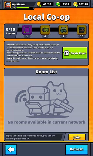 Để chơi với một người bạn, trước tiên cần nhấn vào chế độ Local Co-op tại màn hình Trials. Bây giờ, hãy nhấn vào nút Create Room để host một phòng. Thao tác này sẽ hiển thị Room IP để người chơi có thể sao chép vào khay nhớ tạm bằng cách nhấn nút Copy.