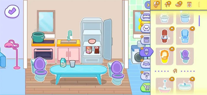 Chạm vào ngôi nhà màu hồng với mái màu tím để bước vào một ngôi nhà trống, sẵn sàng cho việc cải tạo theo ý thích. Để thêm đồ nội thất và đồ trang trí cho mỗi phòng, hãy chạm vào nút ghế ở góc trên bên phải và một menu sẽ xuất hiện ở phía bên phải màn hình. Từ trên xuống dưới, các tab trên menu bao gồm: phòng ngủ, phòng khách, nhà bếp, phòng tắm, sân vườn, đồ trang trí và cửa hàng.