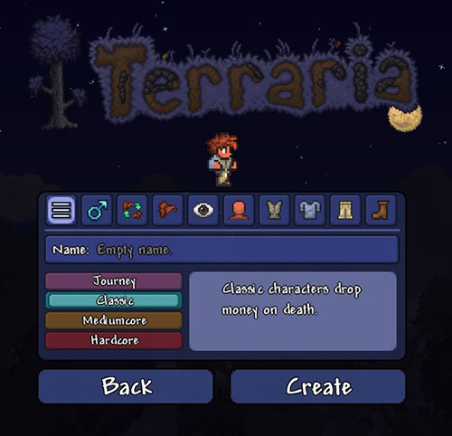 Giống như nhiều game nhập vai, Terraria cho phép người chơi mới lựa chọn chế độ chơi trước khi bắt đầu. Điểm khác biệt là Terraria cho phép tạo nhiều thế giới với các chế độ và mức độ khó khác nhau. Sau khi thiết kế và đặt tên nhân vật, mọi người có thể chọn một trong các chế độ sau: