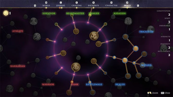 Tuy nhiên, người chơi sẽ không bị bó buộc vào một class vì vẫn có thể chọn mục từ các đường dẫn khác. Khi xem hình ảnh ví dụ dưới đây, có thể thấy rằng người chơi này đang tập trung chủ yếu vào class Wizard, tuy nhiên, các mục dành cho Healer và Battlemage cũng đã được mở khóa.