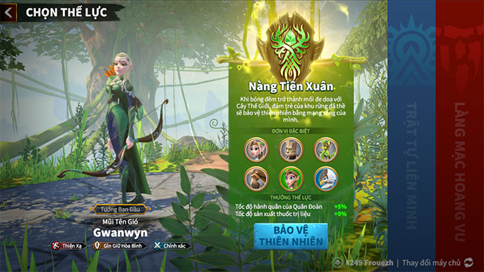Nàng Tiên Xuân đầu tiên, Gwanwyn, với đặc trưng vũ khí là cung tên có tầm tấn công trung bình. Theo sau là các nhân vật Thần Cây Thiết Mộc Lan đóng vai trò bộ binh cận chiến; Thần Cây Lá Dài tấn công tầm xa mang sát thương thuộc tính phép; Hươu Kéo thu thập tài nguyên, sau có thể trở thành thú cưỡi cho kỵ binh và tấn công tầm xa kiêm cận chiến. Cuối cùng, Đại Bàng Rừng là đơn vị kỵ binh có tầm tấn công linh hoạt.
