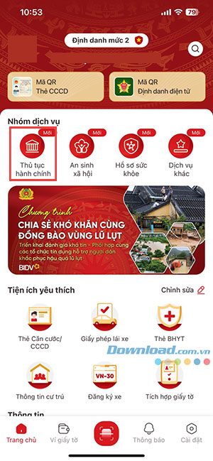 Bước 1: Mở ứng dụng VNeID và tiến hành đăng nhập vào tài khoản. Tại trang chủ ứng dụng, chọn Thủ tục hành chính.