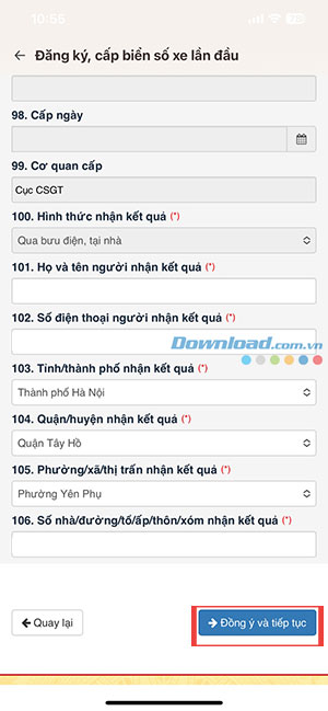 Bước 8: Kiểm tra lại toàn bộ thông tin hồ sơ và nhấn Đồng ý và tiếp tục. Sau đó, mọi người sẽ được hướng dẫn nộp lệ phí.
