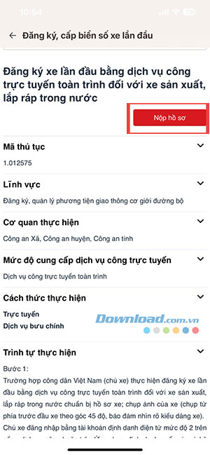 Bước 4: Mọi người sẽ được điều hướng tới trang Đăng ký, cấp biển số xe lần đầu. Lúc này, hãy nhấn nút Nộp hồ sơ.