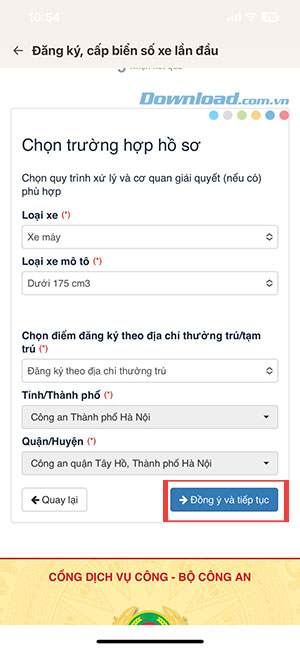 Bước 5: Thực hiện chọn Loại xe, phân khối, điểm đăng ký theo địa chỉ thường trú/tạm trú và nhấn Đồng ý và tiếp tục.