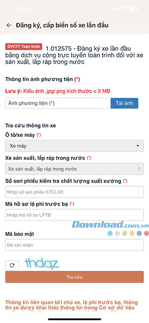 Bước 6: Đăng tải ảnh phương tiện theo yêu cầu, sau đó tiến hành tra cứu thông tin xe bằng cách nhập Số seri, Mã hồ sơ lệ phí trước bạ và nhấn Tra cứu.