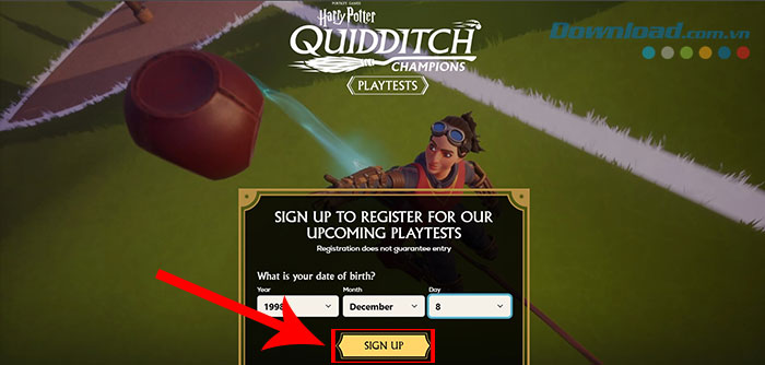 Bước 1: Truy cập trang web đăng ký playtest Harry Potter: Quidditch Champions và chọn ngày tháng năm sinh. Sau đó nhấn Sign up.